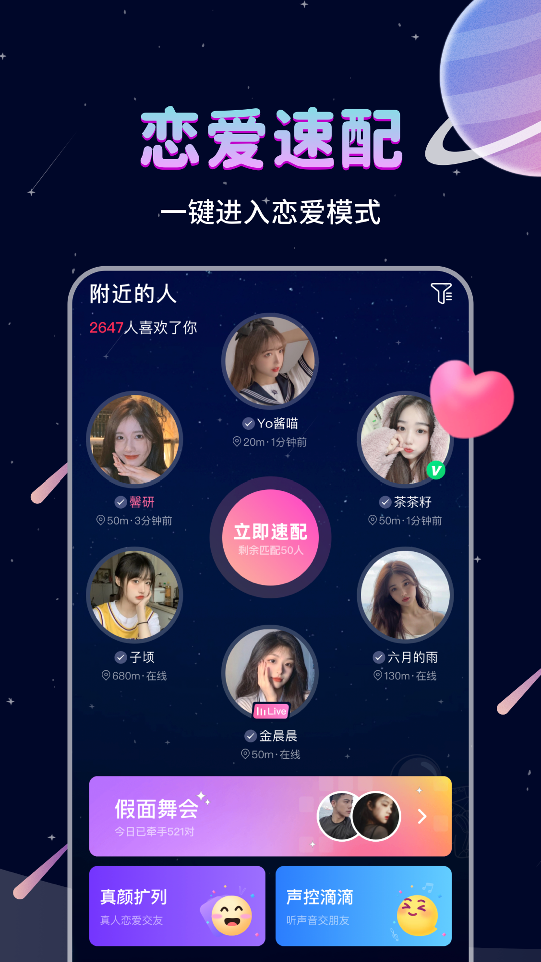 角色扮演面具舞会,指挥、执行、即兴表演。语音速配匿名连麦,不看颜值走心交友,用声音撩开面具下的秘密。