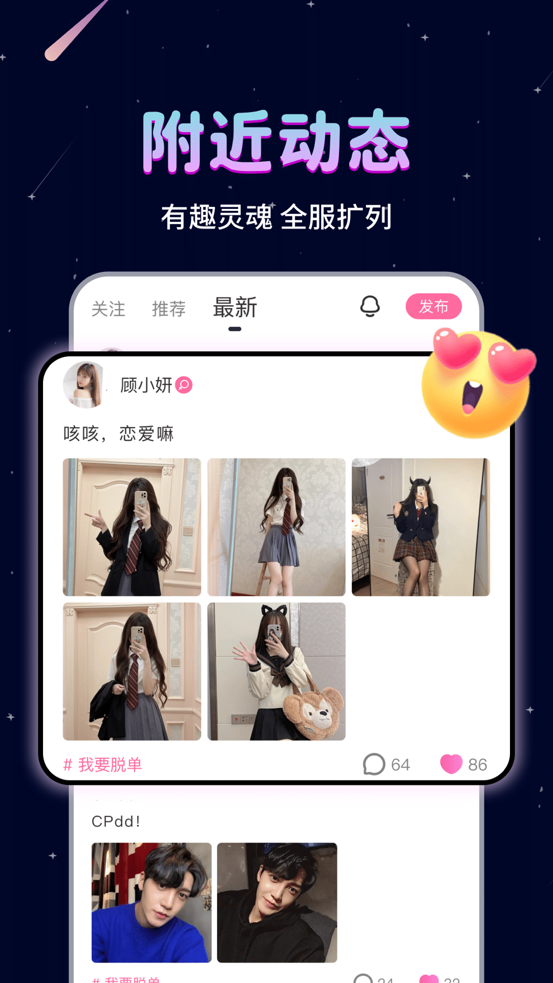 快速扩列分配对象,假装情侣体验一周CP,恋爱任务互动,连麦哄睡叫醒,红蓝CP带你立即进入恋爱模式。