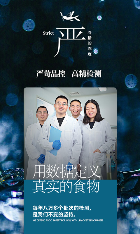 【春播品控】春播食品通过拥有市场监督管理局颁发的中国计量认证(CMA)资质的品控实验室及专业团队检测。商品拥有独立ID,全程可追溯。