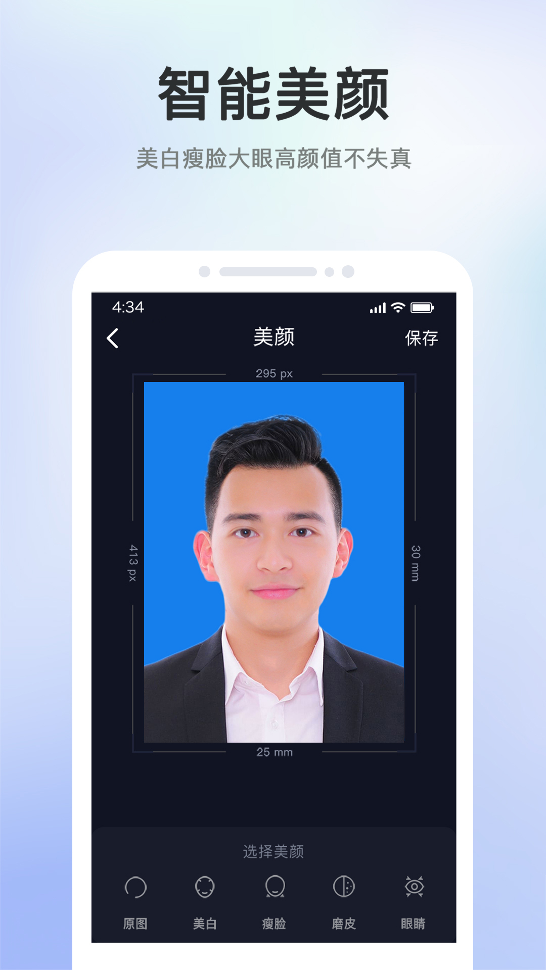 证件照智能大师是一款各种尺寸证件处理工具,专业抠图裁剪对应尺寸证件照,智能匹配证件合适底色,满足你所有证件照需求。 1、 自动裁剪,智能换底,自带美颜,让您证件照成为两点 2、 适配几十种不同场景证件尺寸,节省繁琐查找尺寸大小 3、 两步处理,一键保存到相册、在线冲印包邮到家更省心 。