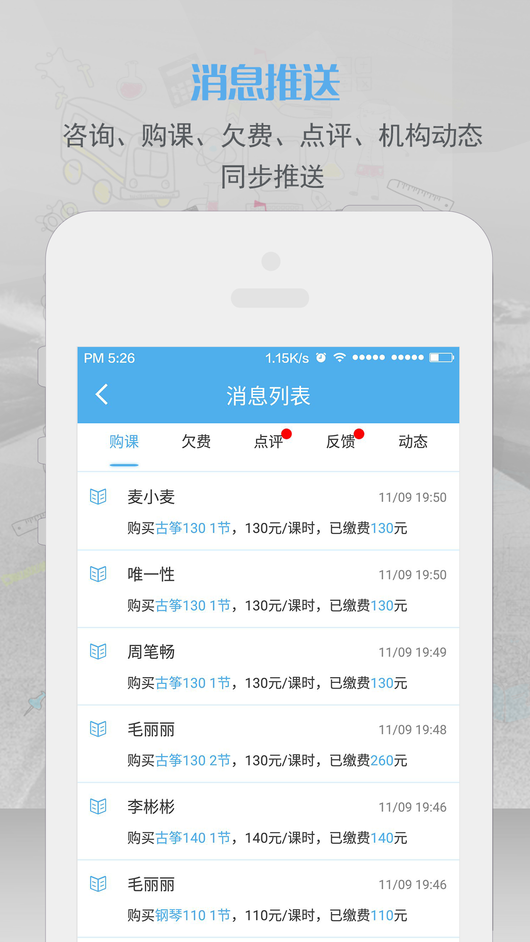 购课、欠费、点评、反馈、机构动态、咨询同步推送