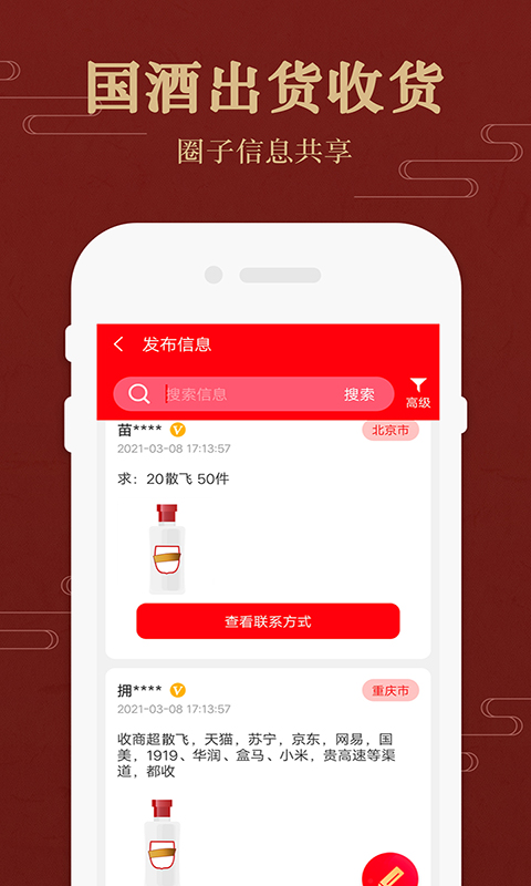 用户可发布国酒的出货、收货信息,平台为全国提供收购信息,促成双方交易,为大家提供方便。